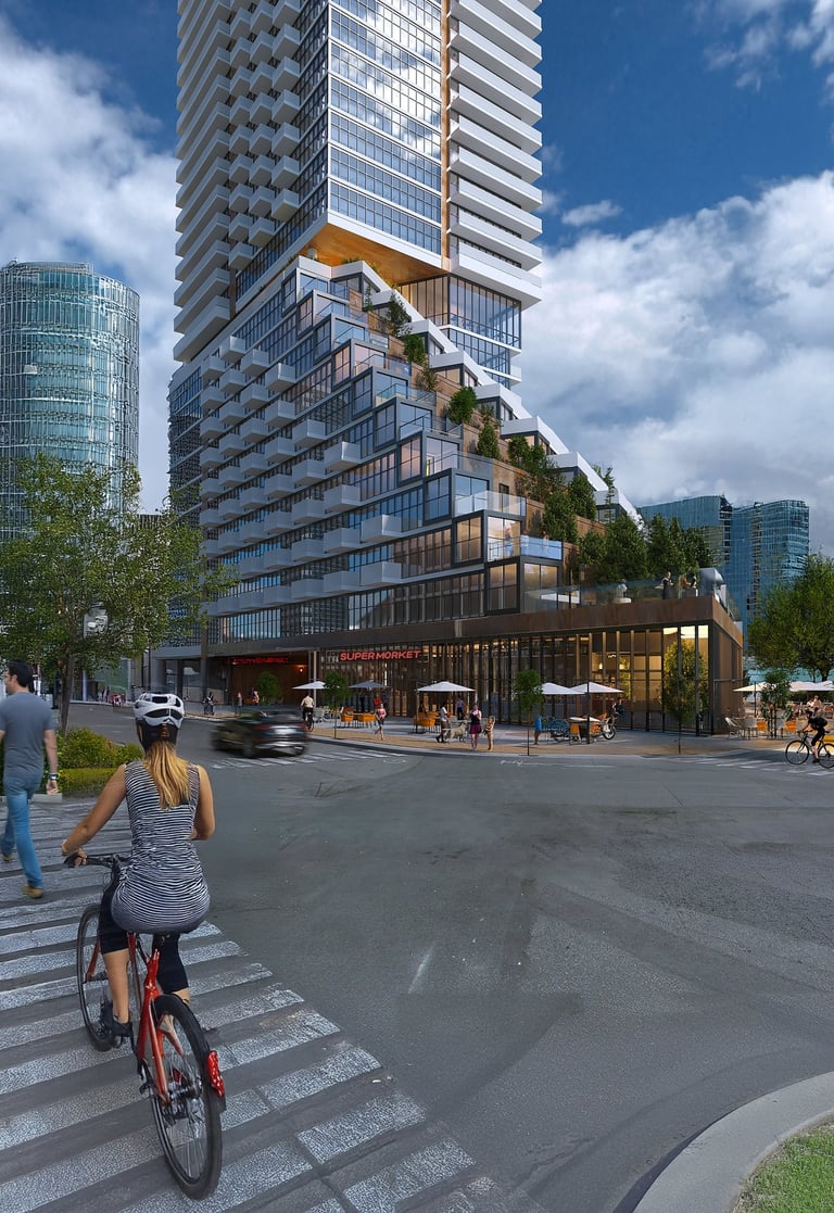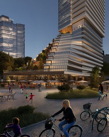 With commercial spaces at grade, the project activates the street level, enhancing the pedestrian experience and fostering community interaction. It also proposes lively urban plazas that seamlessly connect to the park, creating public spaces that encourage social engagement and outdoor activity.