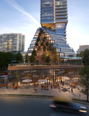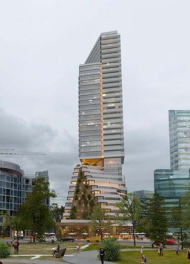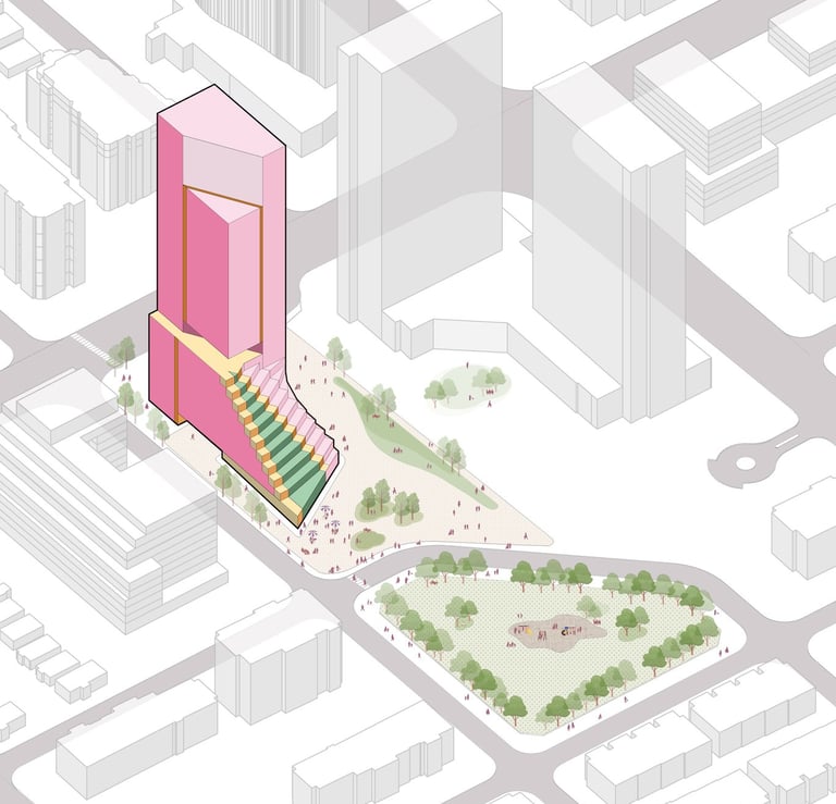 This building features a striking contemporary design with a combination of stacked and stepped elements, creating a visually dynamic structure. The lower section consists of terraced levels that gradually recede, forming multiple step-backs. These terraces integrate greenery and outdoor spaces, offering excellent views of the adjacent park while also softening the building’s overall massing.