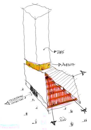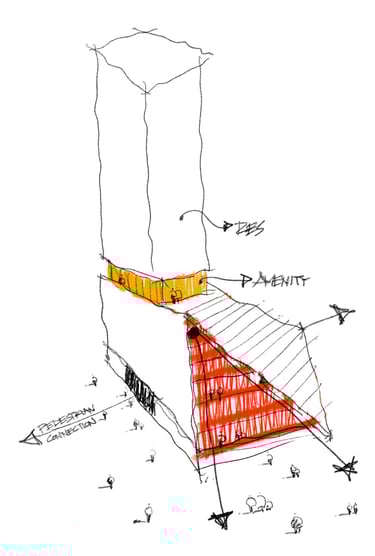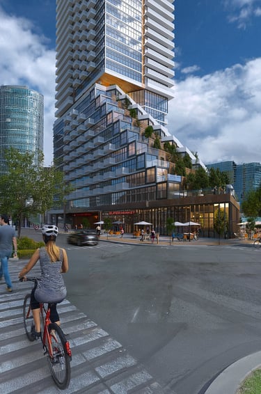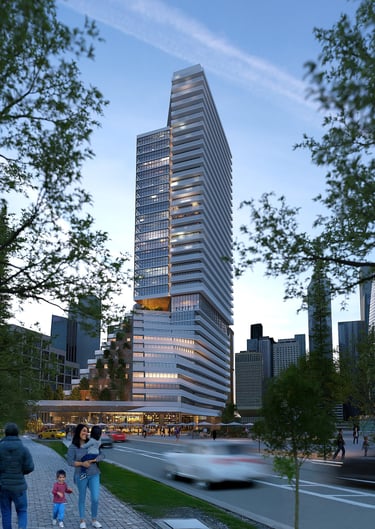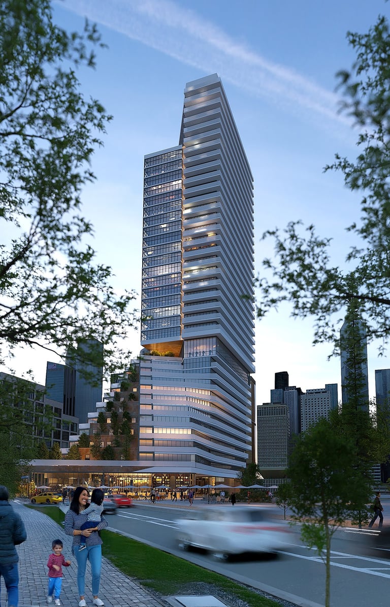 The proposed 30-storey high-rise tower is envisioned as a vibrant mixed-use development, strategically located within a high-density block adjacent to an urban neighborhood park.