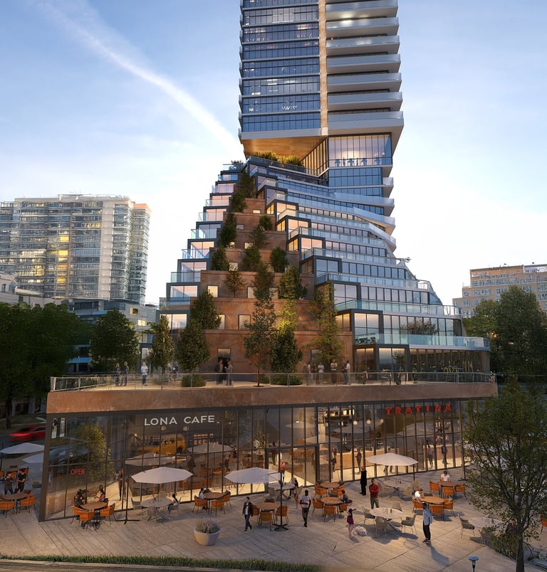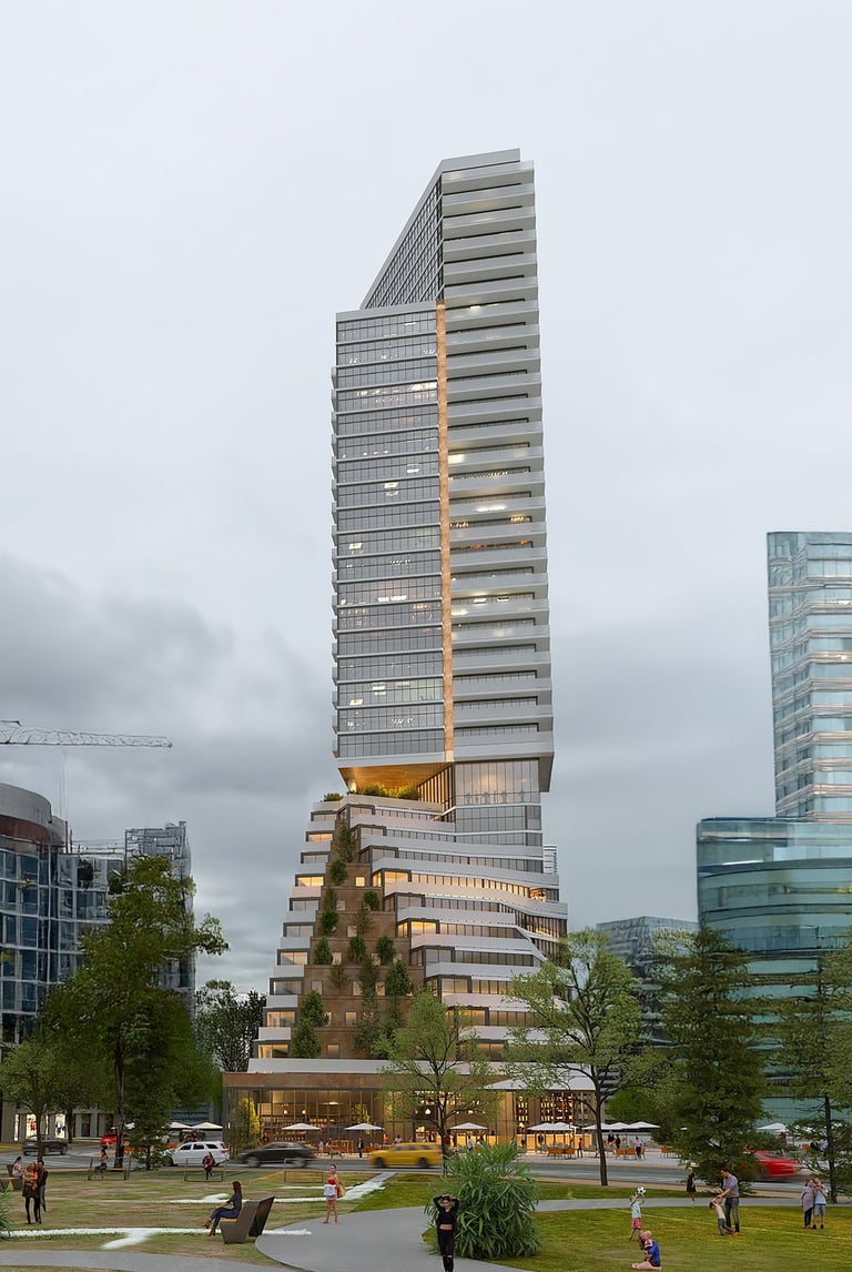 The building is sculpted through a series of strategic setbacks, creating generous terraces that cascade down, offering residents sweeping views of the green space below.