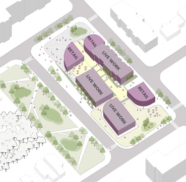 This integration of live/work typologies with an activated alleyway cultivates a vibrant, 24/7 community, boosting productivity, social interaction, and quality of life for those who live and work here.