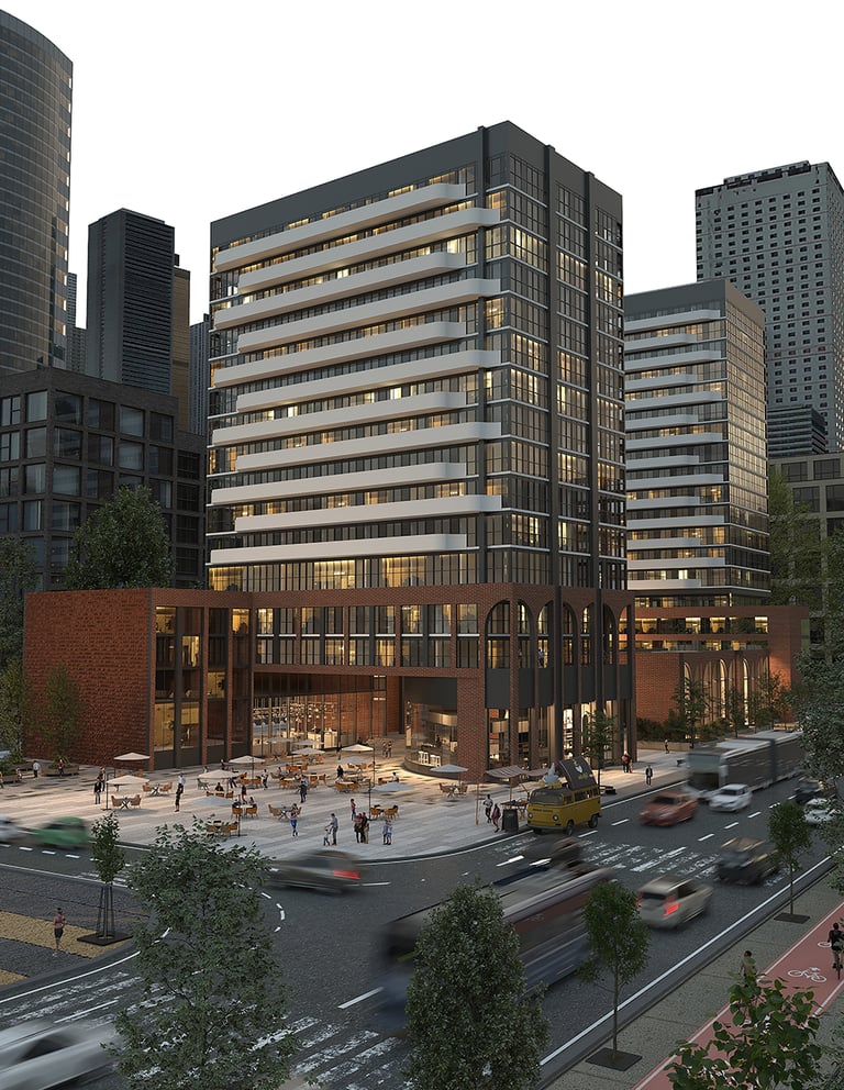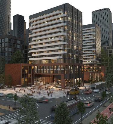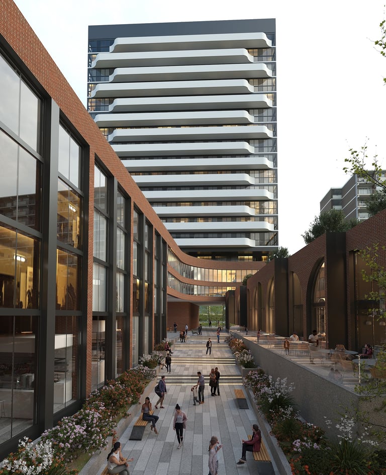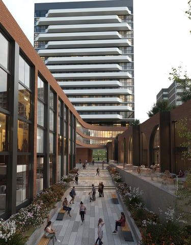 To activate the urban realm, the design prioritizes permeability, openness, and connection with the city. The podium engages directly with the streetscape, inviting movement through its public plaza, vibrant retail spaces, and activated alleyway.