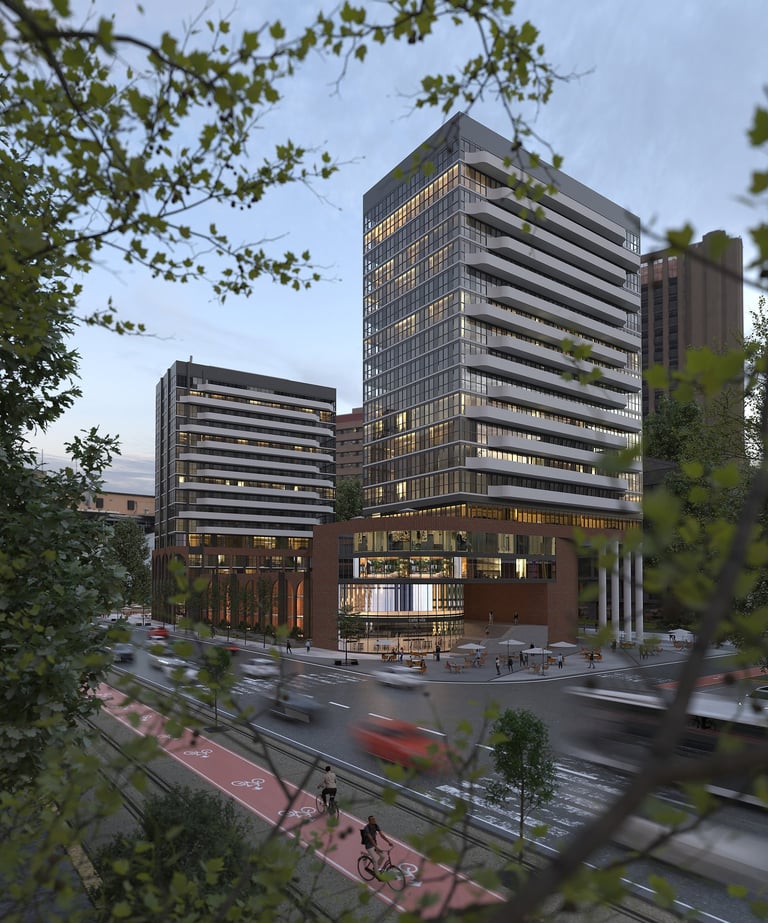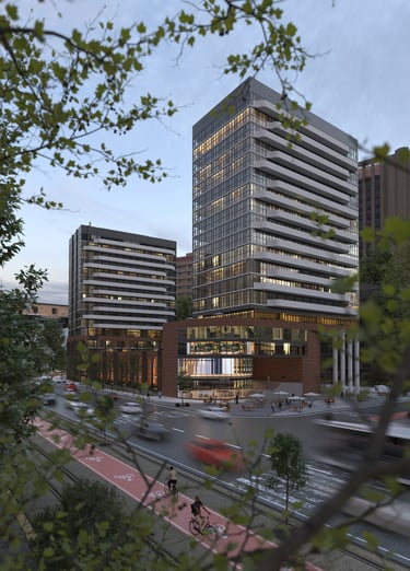 The project features two elegantly proportioned towers, strategically positioned to maximize views, natural light, and privacy for residents. The distance between them not only enhances sightlines to the city and surrounding landscape but also allows for a sense of openness within the dense urban fabric.