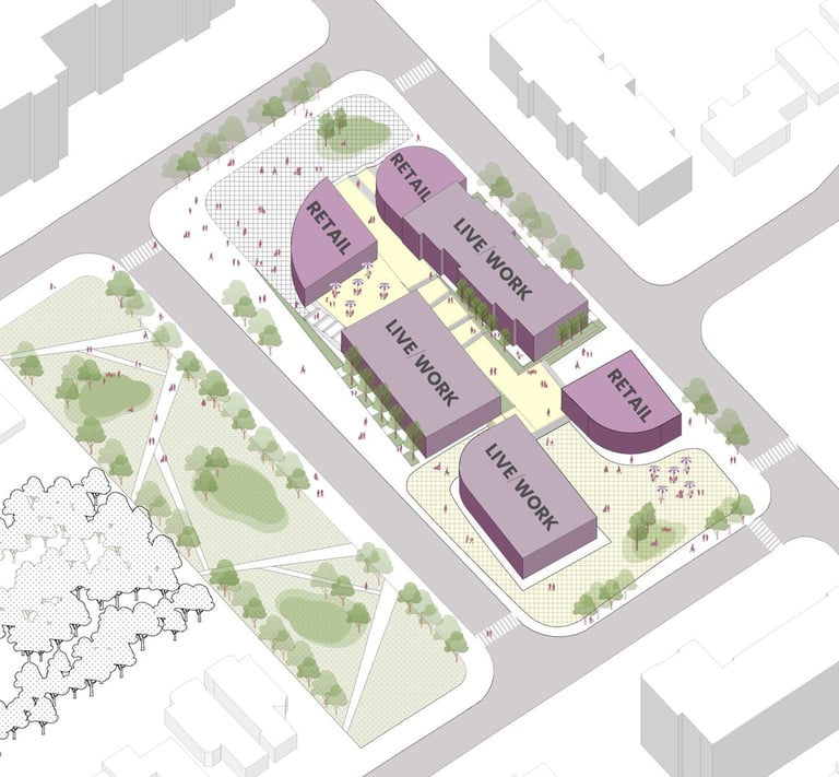 By introducing voids, courtyards and arcades, the design allows for seamless interaction between public and private spaces. These interventions invite movement through the site rather than forcing detours around it, reinforcing accessibility and engagement with the park and surrounding streetscapes.